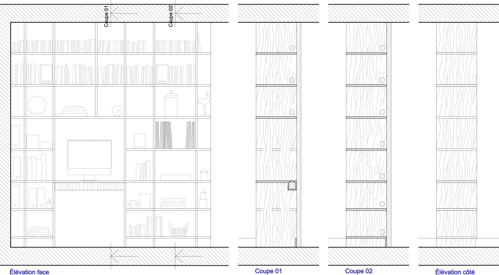 Dans le séjour, une bibliothèque toute hauteur vient d’adosser contre une cloison. Le souhait était de pouvoir ranger des livres de poches mais aussi des plus grands formats, des vinyles, une platine et un système hifi, un coin bureau. L’ensemble devait pouvoir évoluer, être déplacé, être compléter par des équipements nécessitant d’être branchés sur des prises. Il a donc été prévu des percements en fond de meuble pour passer des câbles mais pas aux extrémités pour des raisons esthétiques.