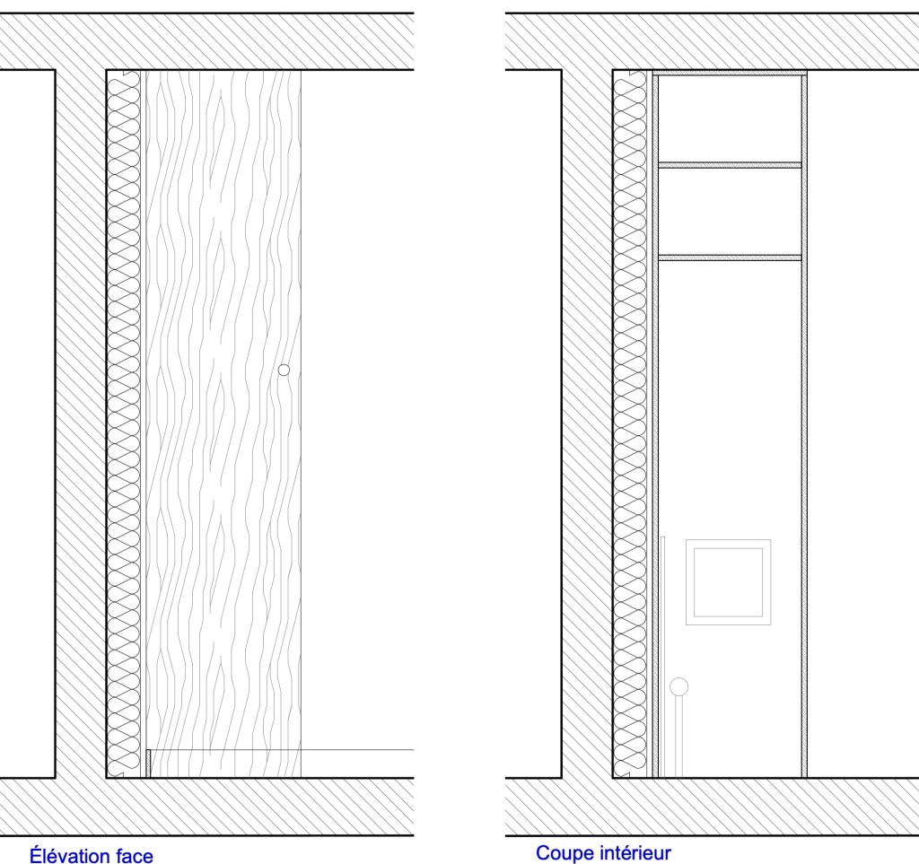Dans le recoin d’une chambre, se trouvait un placard avec les nourrices du compteurs d’eau. Là aussi les prestations proposées en base n’étaient pas au gout des clients. Ils ont préféré faire une porte très simple et discrète qui vient parfaitement s’intégrer au mur, transformant un placard technique en un élément harmonieux.