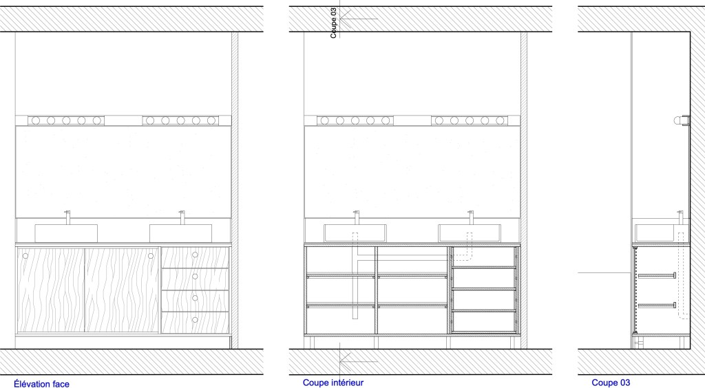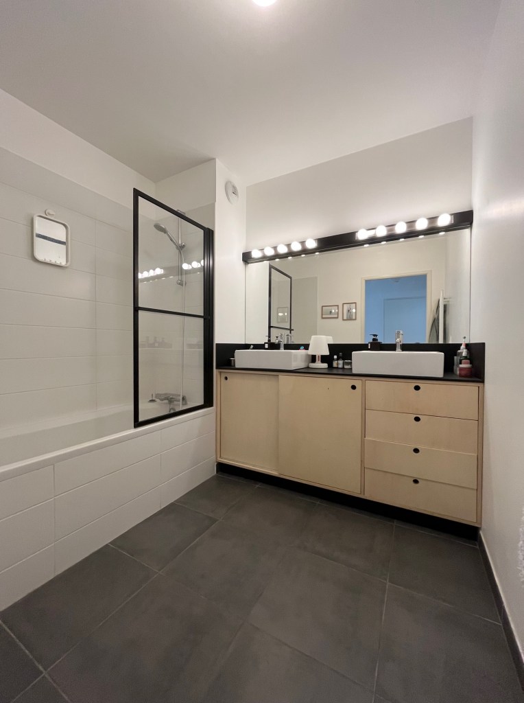 Pour tirer profit de l’espace disponible, un meuble sur mesure a donc été réalisé avec deux vasques posées sur un plan de travail en Fenix avec un grand miroir et deux luminaires alignés. En partie basse, une colonne de tiroirs permet de ranger les petits objets et deux placards avec portes coulissantes pour ranger les serviettes et autres affaires plus volumineuses.