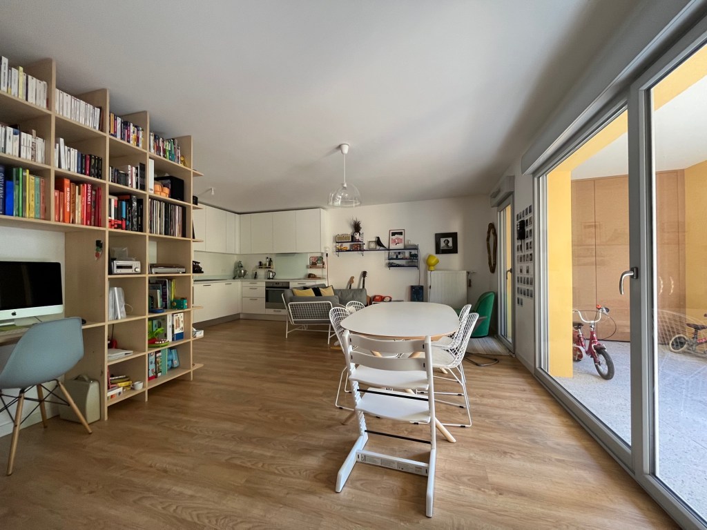 Au fil des années, la vie dans l’appartement et son organisation ont évolué ; la bibliothèque a changé de configuration, faisant de la place dans les rayonnages du bas à des jeux et des livres pour enfants. Tout comme dans le meuble de la salle de bain, les étagères et les tiroirs ont fait de la place pour ranger des couches et autres produits bébés.