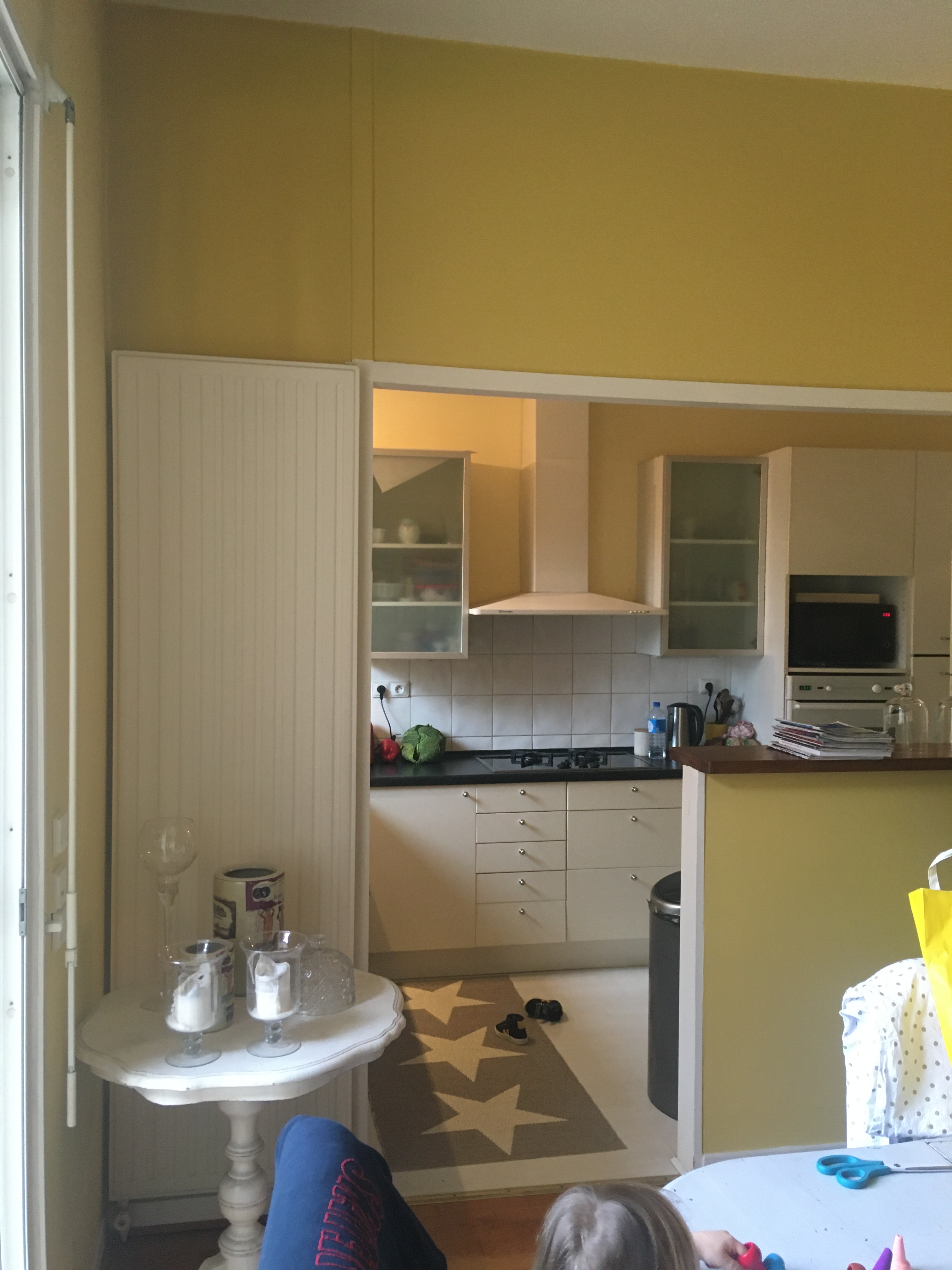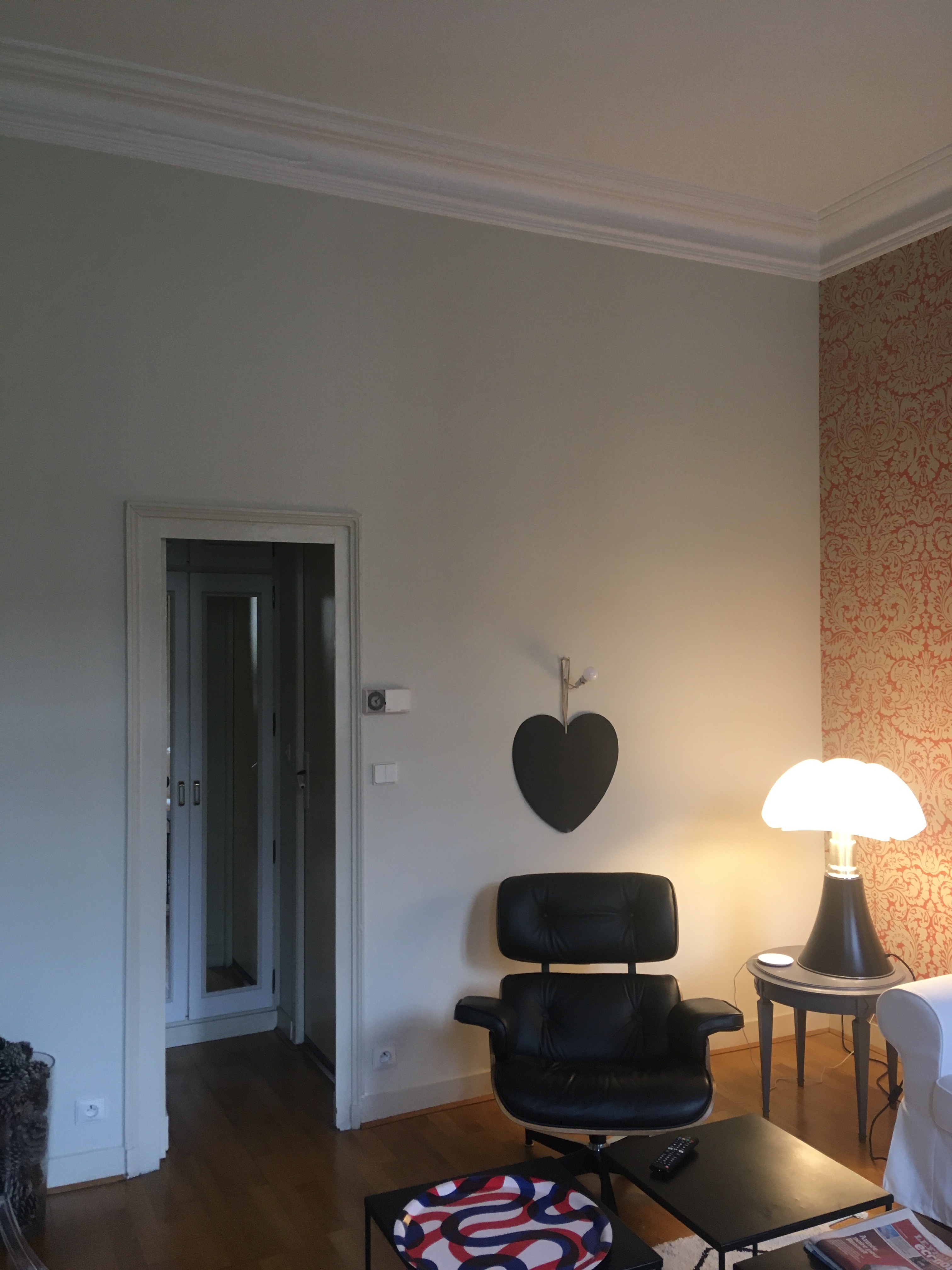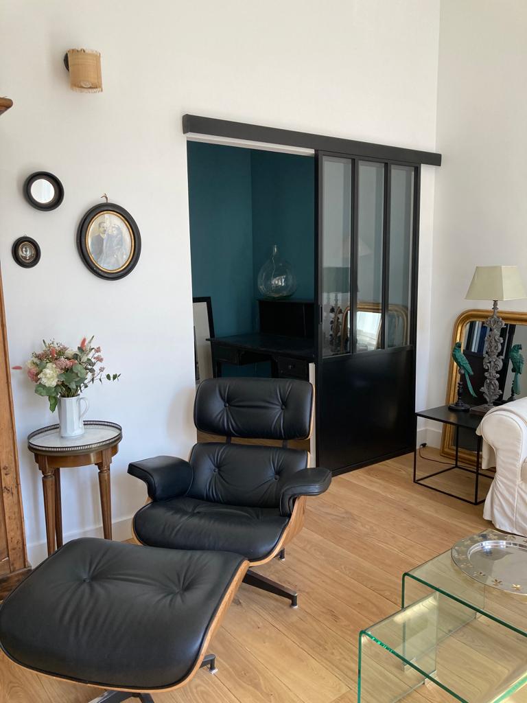 A côté du salon, un espace a également été réagencé car très peu utilisé. Il s’agit d’un dégagement avec placard menant à une salle d’eau. A la place, un petit salon vitré est proposé, il peut être fermé pour lire au calme ou alors ouvert sur l’espace principal pour partager l’écoute d’un vinyle. Il était indispensable de conserver des toilettes pour le rez-de-chaussée, ils sont donc intégrés en second plan par rapport au salon.