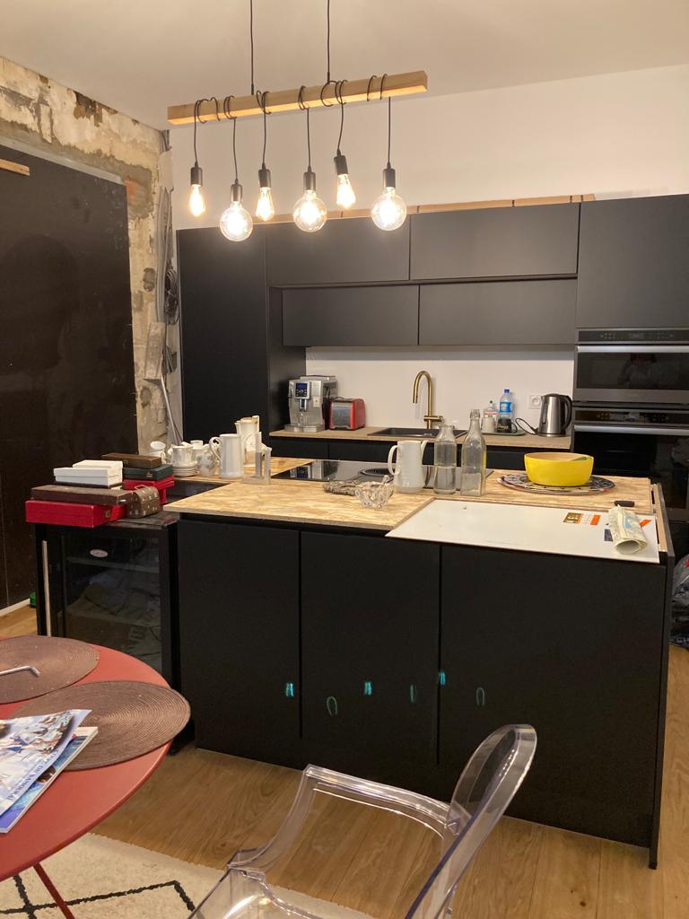 Au rez-de-chaussée, il a été proposé de réunir la salle à manger et la cuisine pour avoir un espace plus ouvert, autour duquel la famille pourrait circuler et se réunir avec leurs enfants ainés, maintenant adultes pour un déjeuner convivial. La paroi non porteuse qui séparait les deux espaces a été déposée, la cuisine a changé de configuration pour être plus fonctionnelle et spacieuse. Sur le mur du fond, aux extrémités, des éléments toute hauteur permettent d’intégrer tous les gros appareils (réfrigérateur, four et four micro onde, lave vaisselle). De part et d’autres, un grand linéaire de plan de travail avec un évier et des rangements hauts et bas permettent d’avoir du rangement et d’installer les petits appareils électroménager. En face, un ilot aux dimensions généreuses, constitue le centre de la pièce, on peut tourner autour, prendre place d’un côté, participer à la préparation du repas ; il rassemble la famille. A proximité directe, une grande table permet de réunir tout le monde.