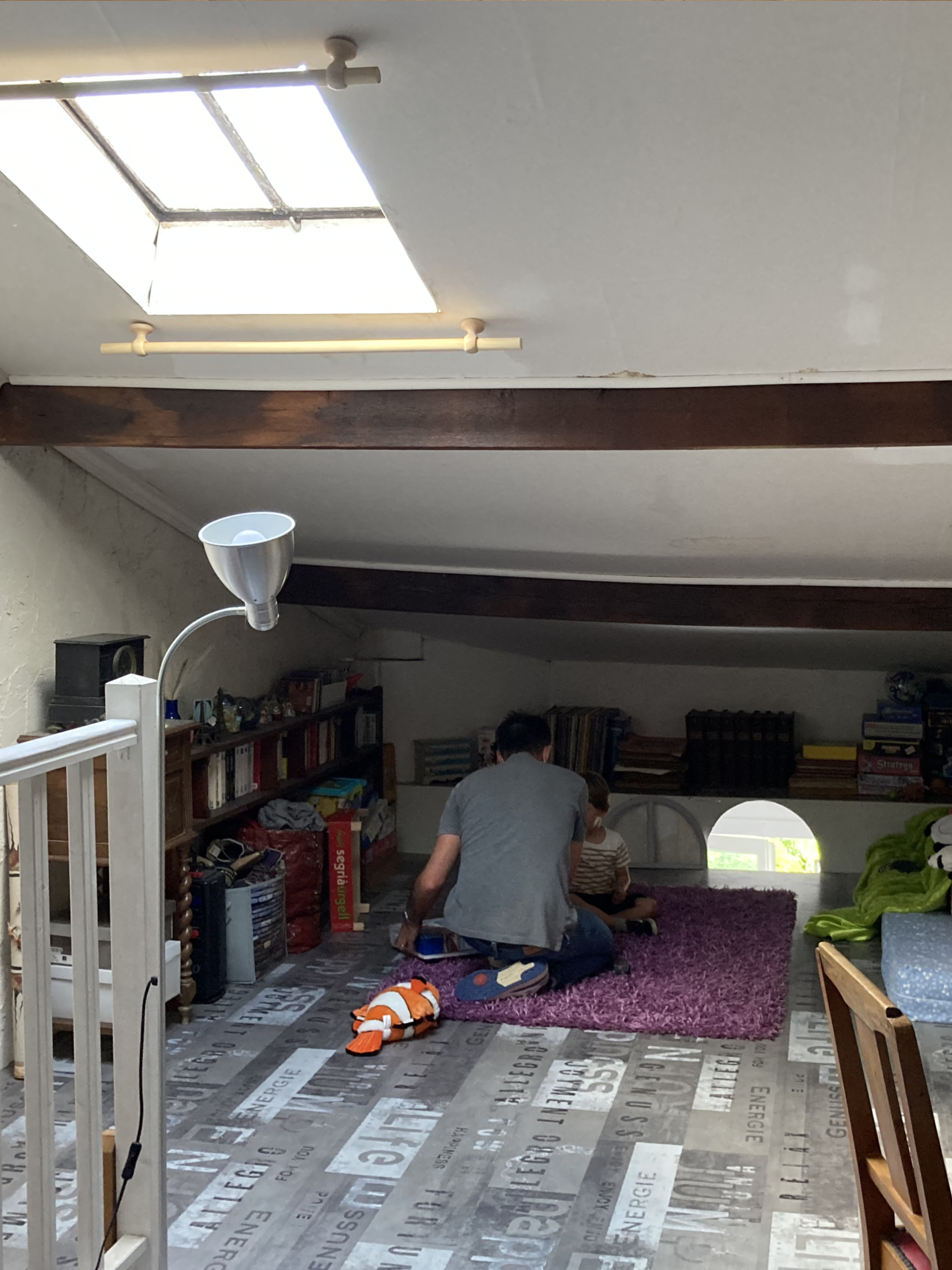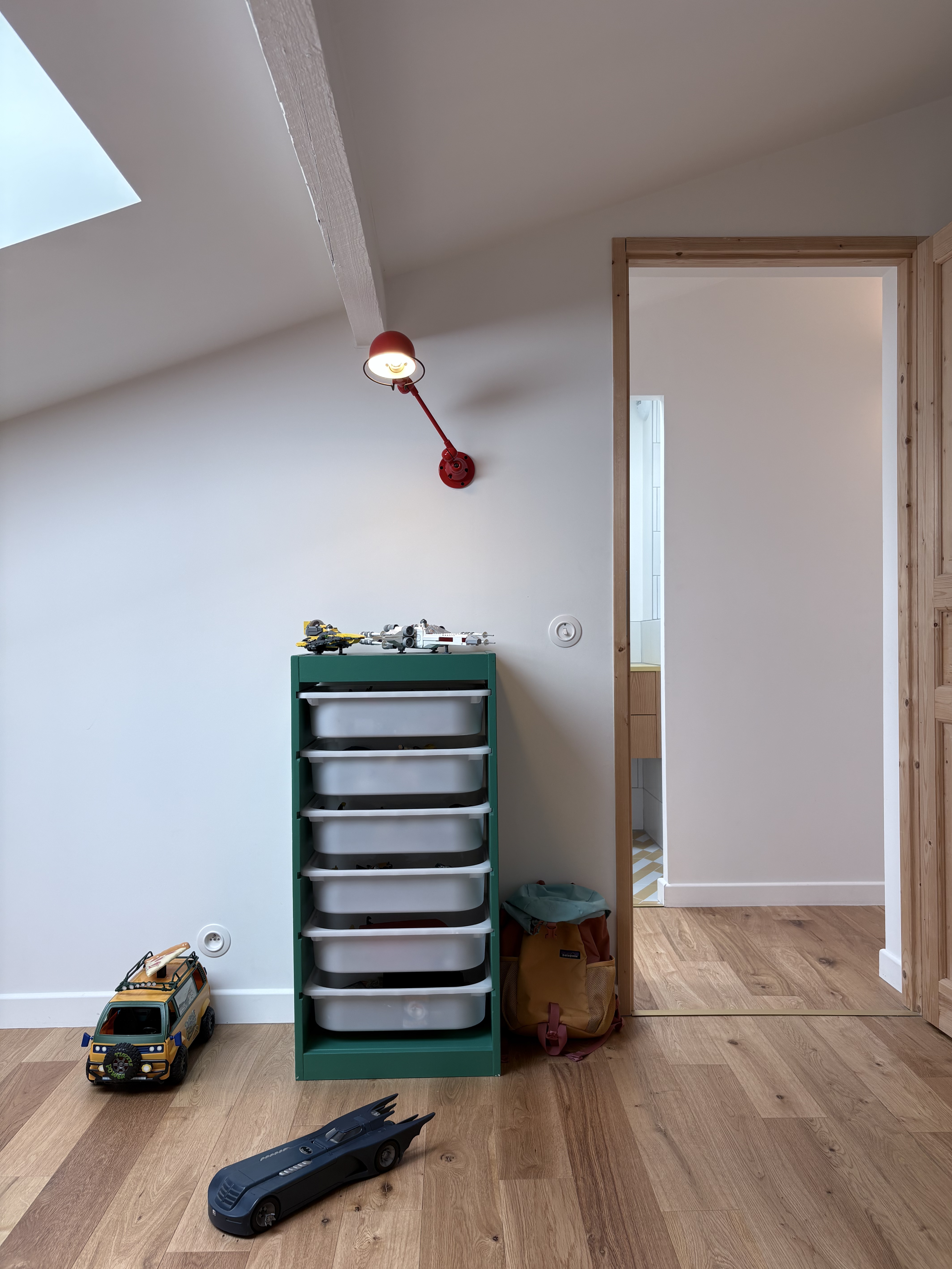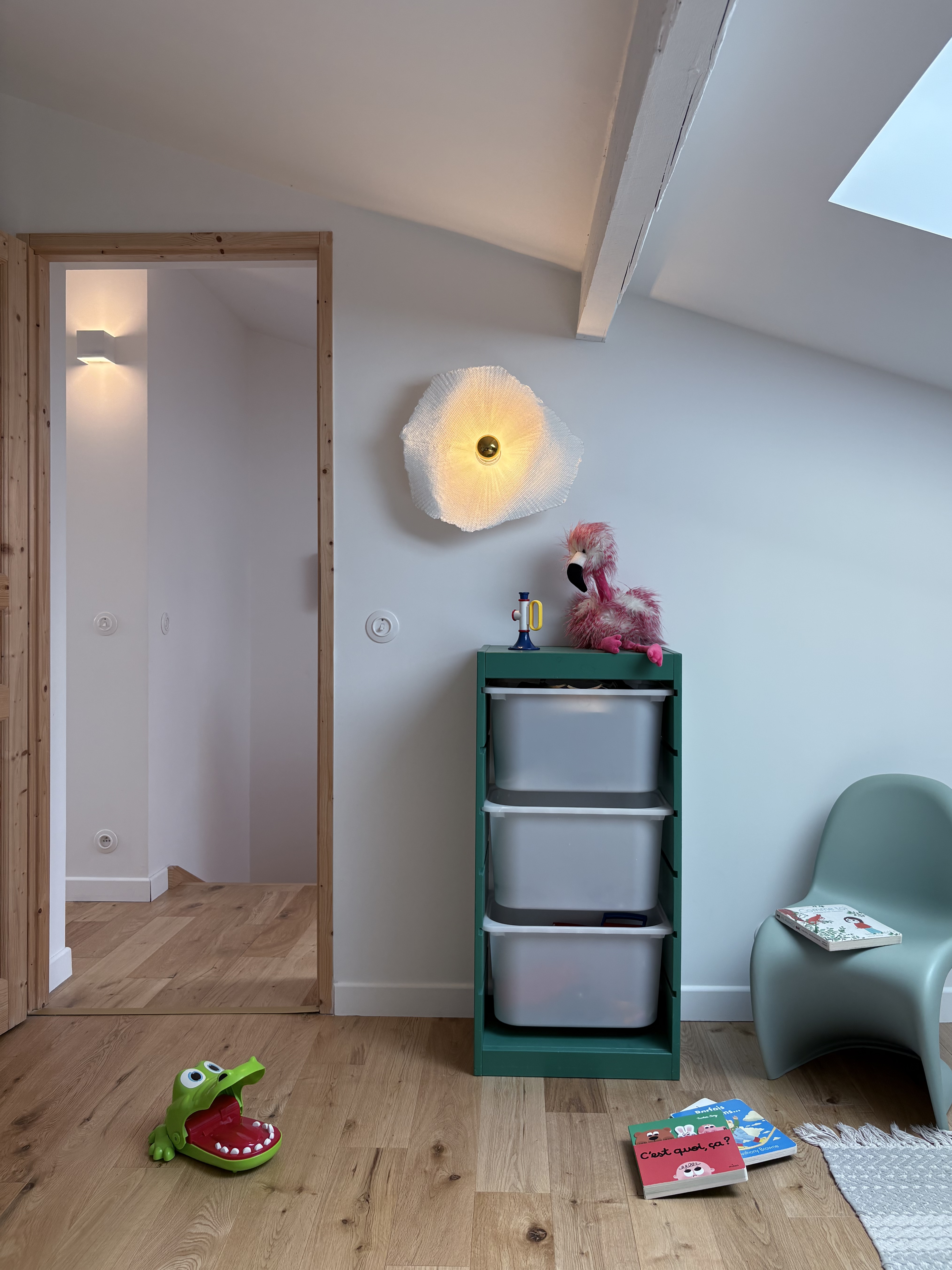 Dans les combles, les deux chambres d’enfants sont identiques et symétriques, des meubles sur mesure ont été réalisés en partie basse du rampant pour créer des rangements là où la hauteur sous plafond est trop faible pour occuper autrement l’espace. Une salle d’eau avec toilette est attenante, elle est pratique et favorise l’autonomie des enfants. Aux deux extrémités les plus basses sont aménagées une salle de jeux et un filet d’habitation très lumineux. Les enfants prennent plaisir à jouer, lire et inventer des histoires dans ces espaces qui sont les leurs.