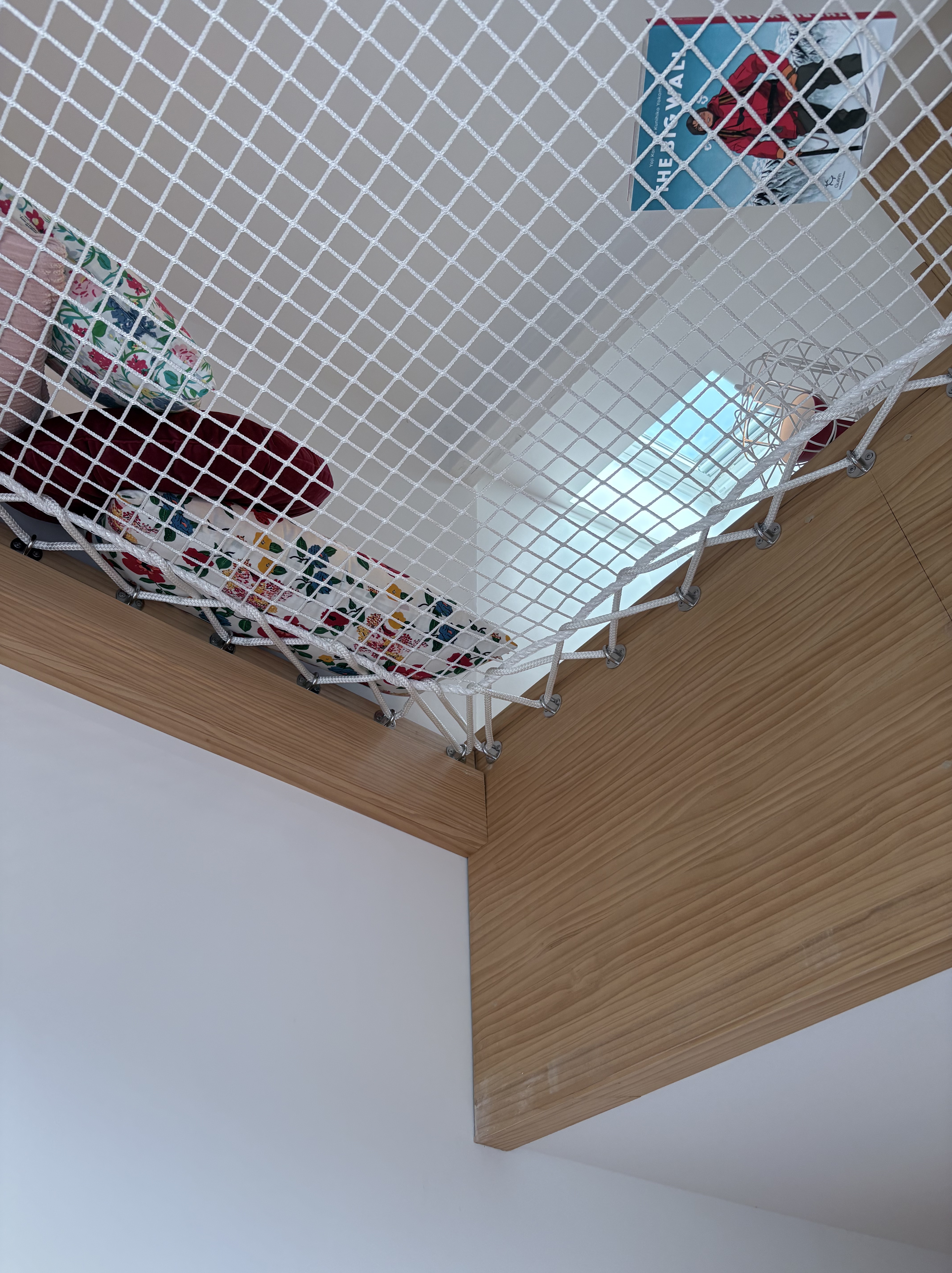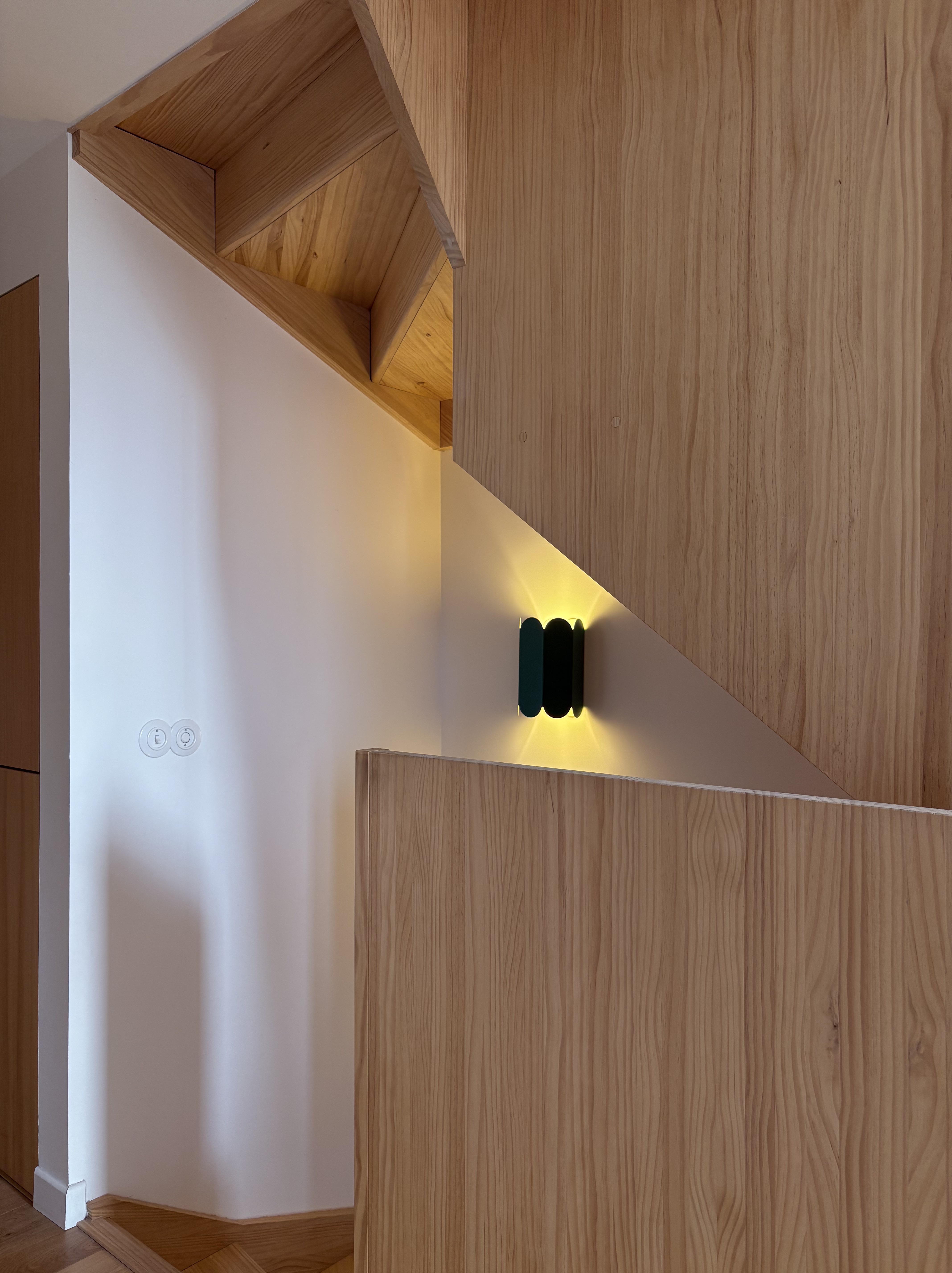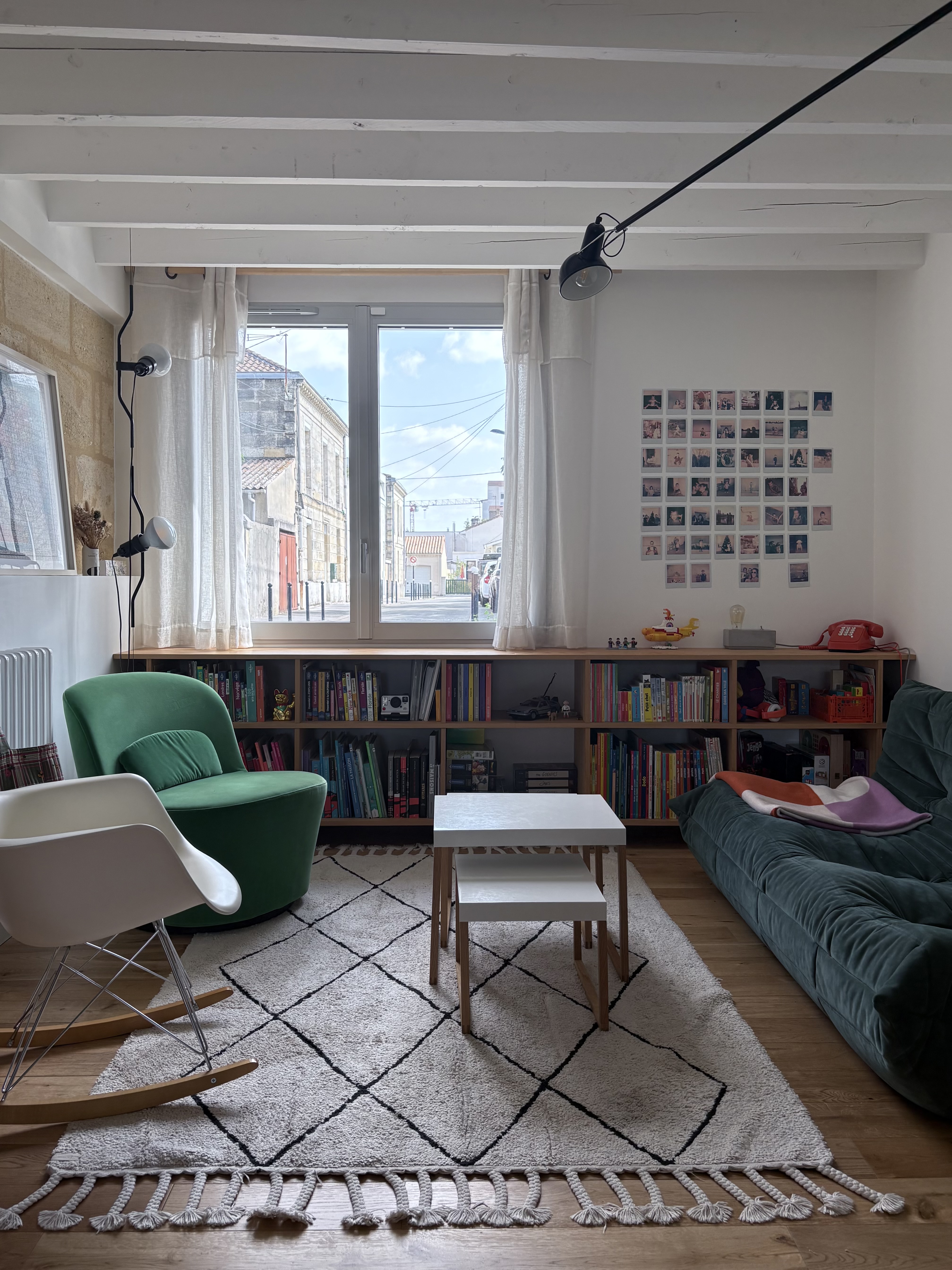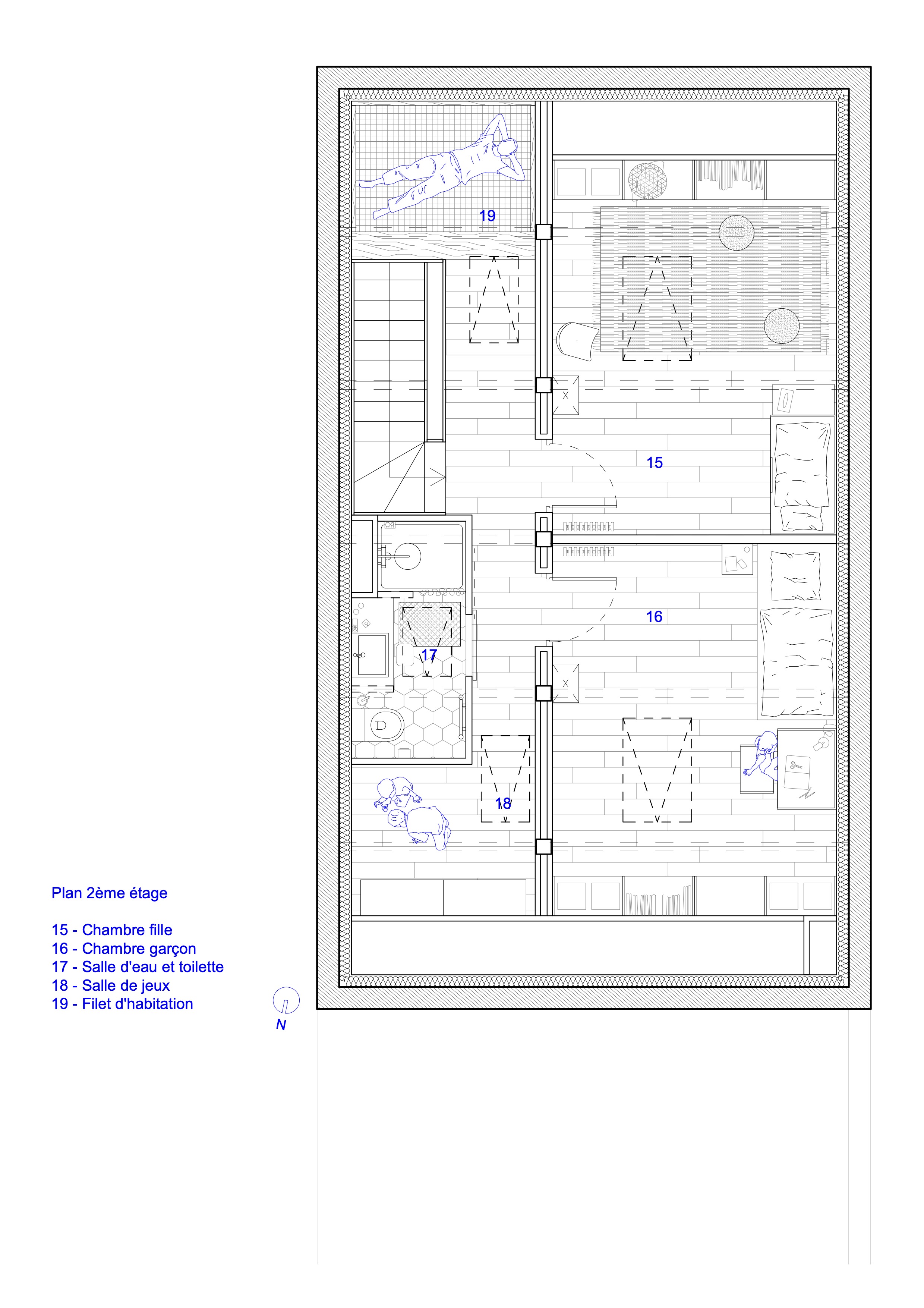 Dans les combles, les deux chambres d’enfants sont identiques et symétriques, des meubles sur mesure ont été réalisés en partie basse du rampant pour créer des rangements là où la hauteur sous plafond est trop faible pour occuper autrement l’espace. Une salle d’eau avec toilette est attenante, elle est pratique et favorise l’autonomie des enfants. Aux deux extrémités les plus basses sont aménagées une salle de jeux et un filet d’habitation très lumineux. Les enfants prennent plaisir à jouer, lire et inventer des histoires dans ces espaces qui sont les leurs.