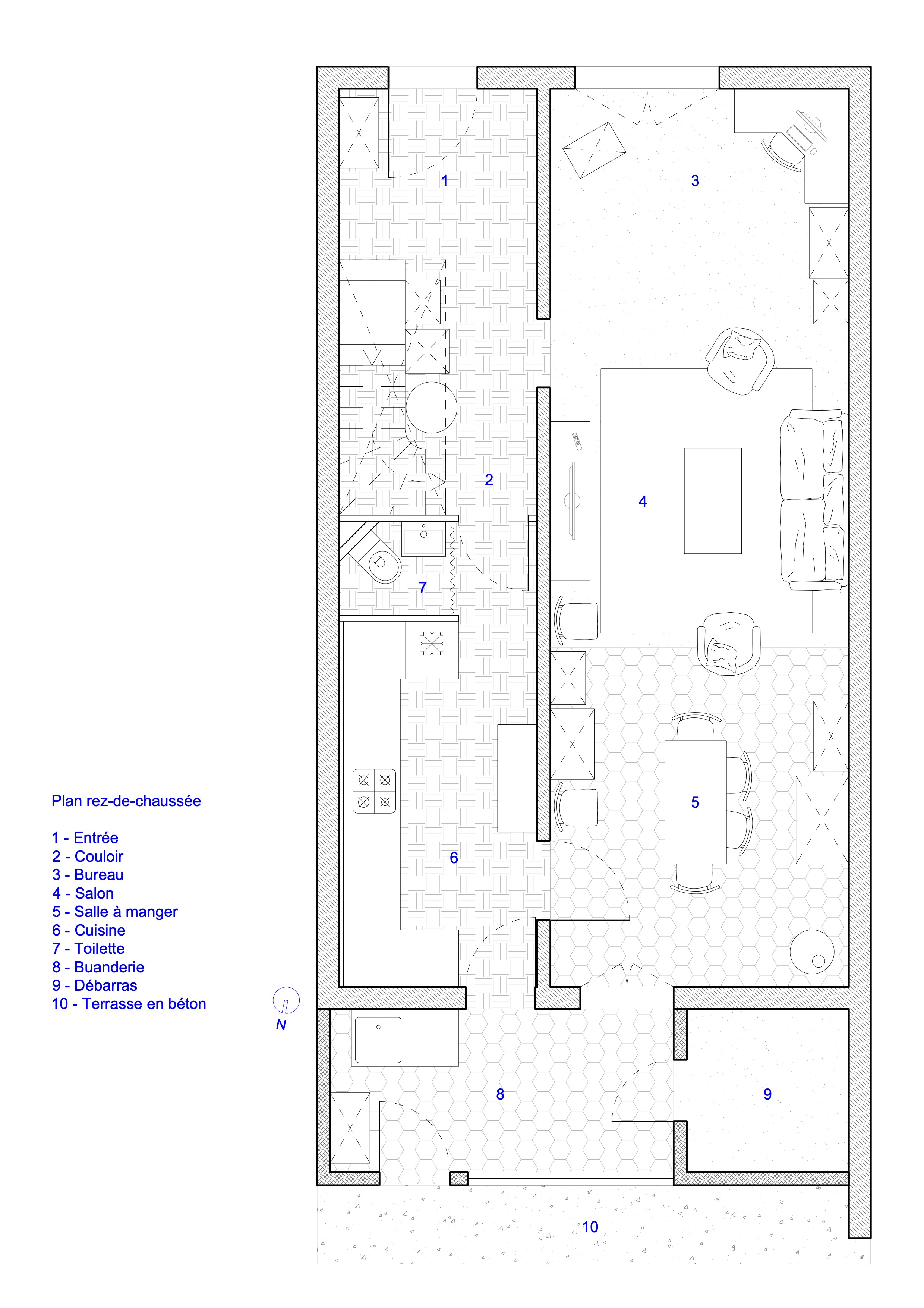 Mission : conception, sélection des entreprises et coordination des travaux – Client : Couple avec deux enfants – Superficie : 139 m² – Durée des travaux : 6 mois