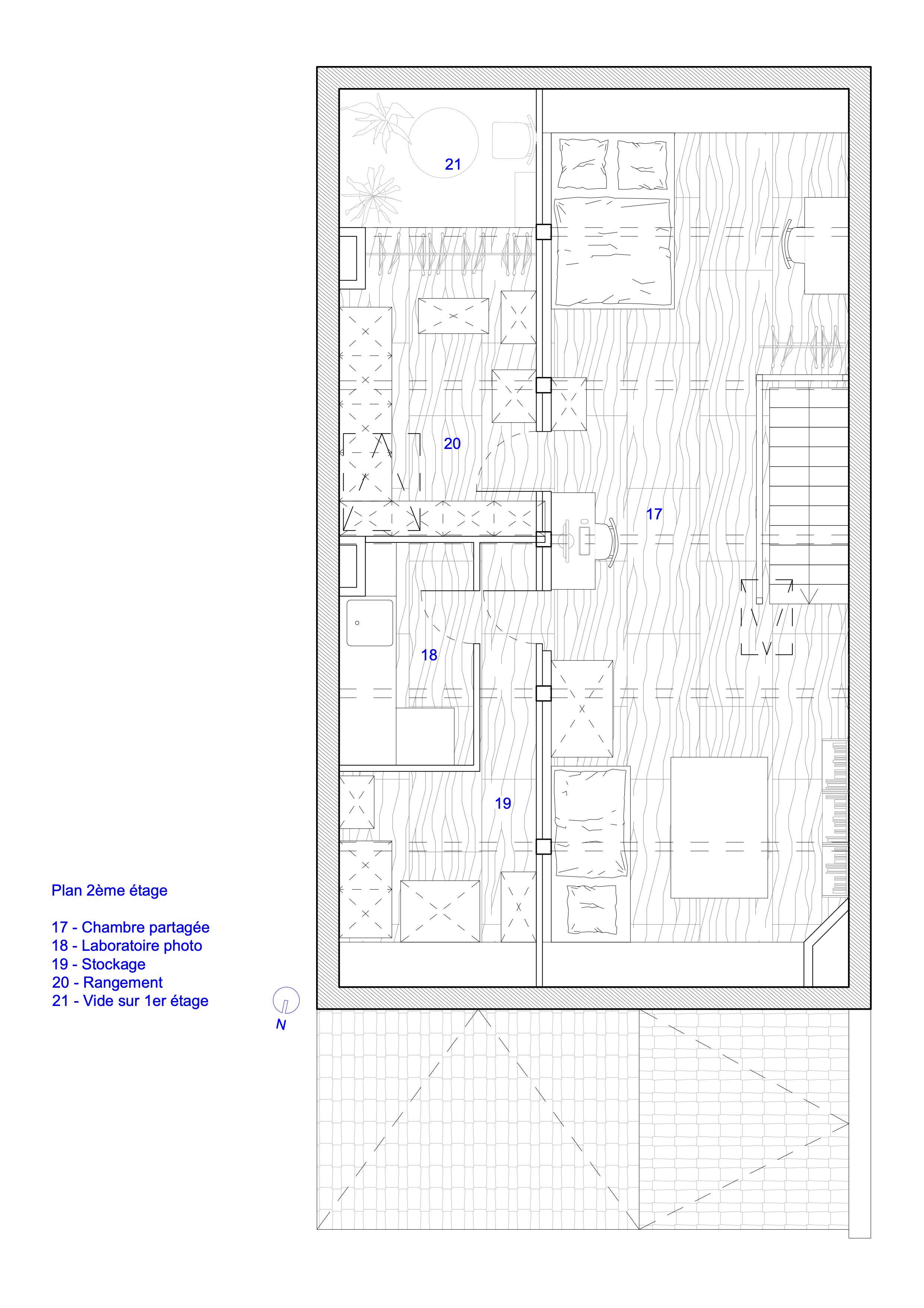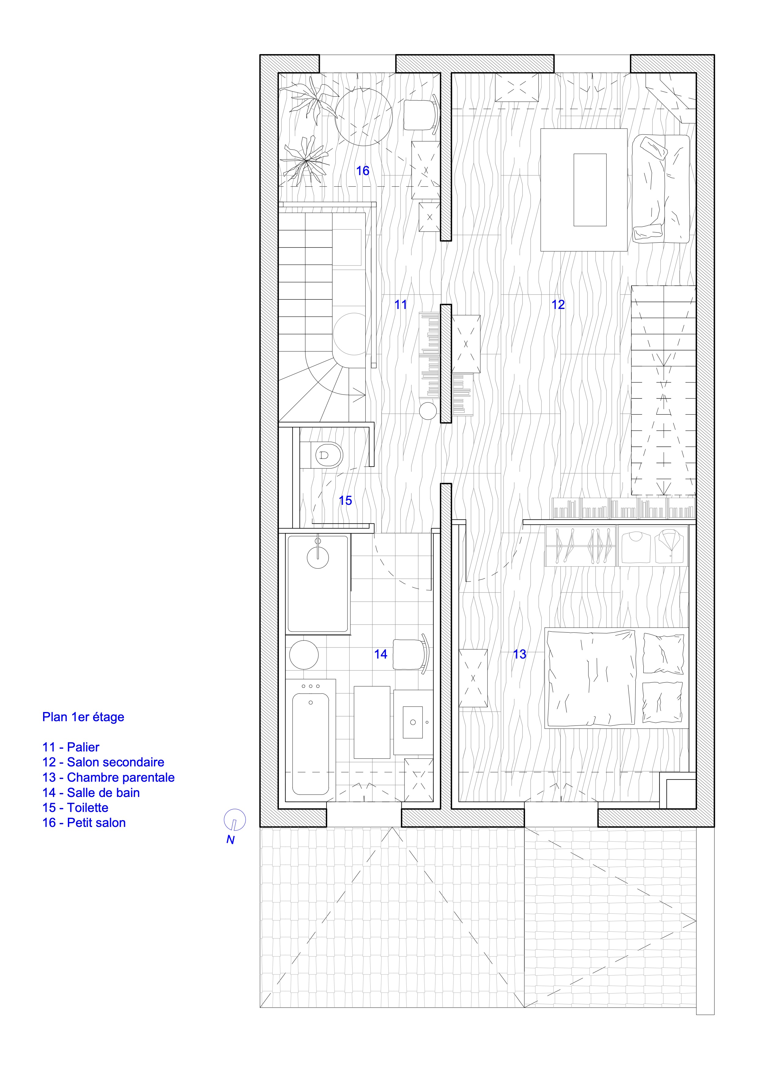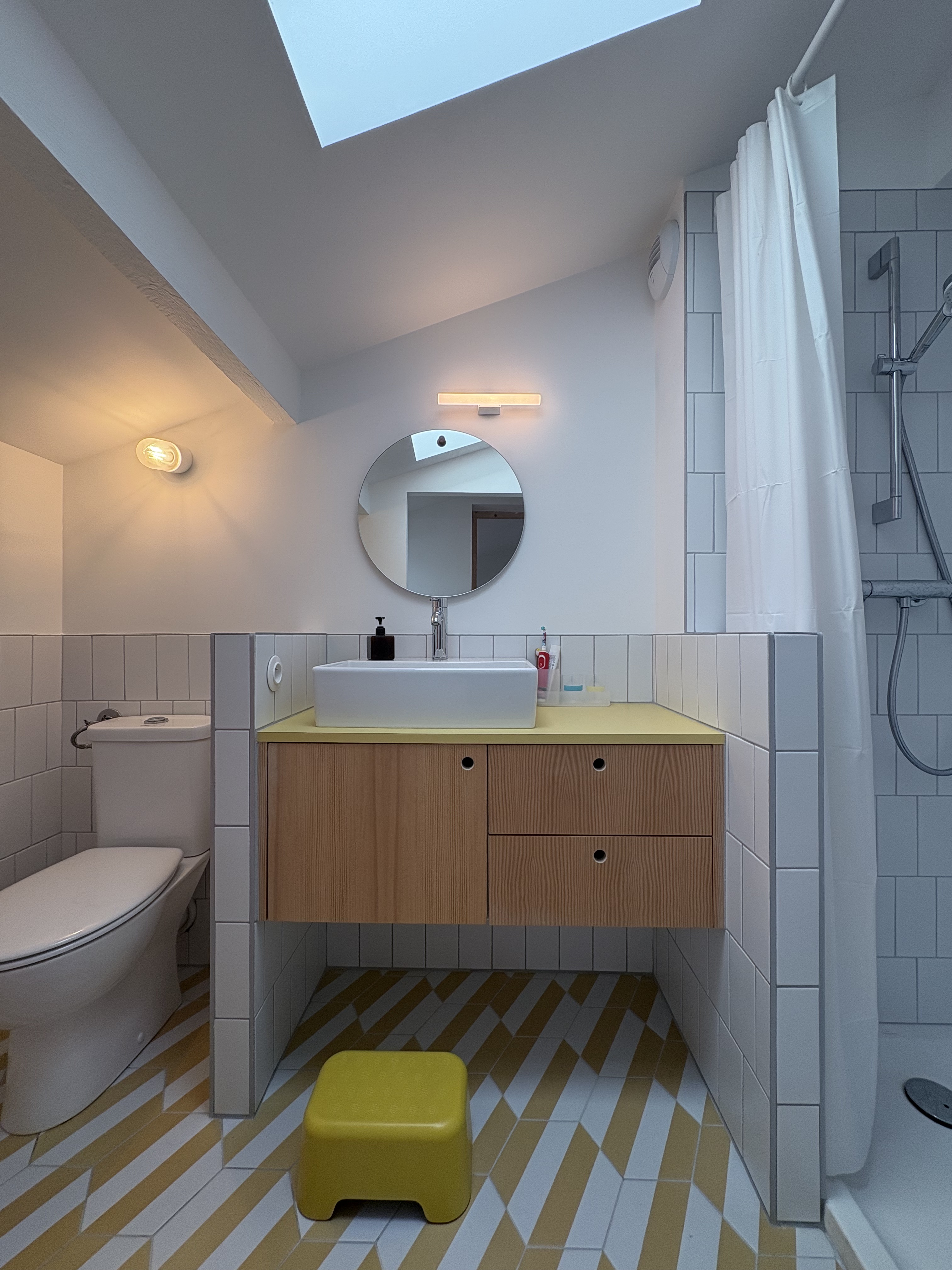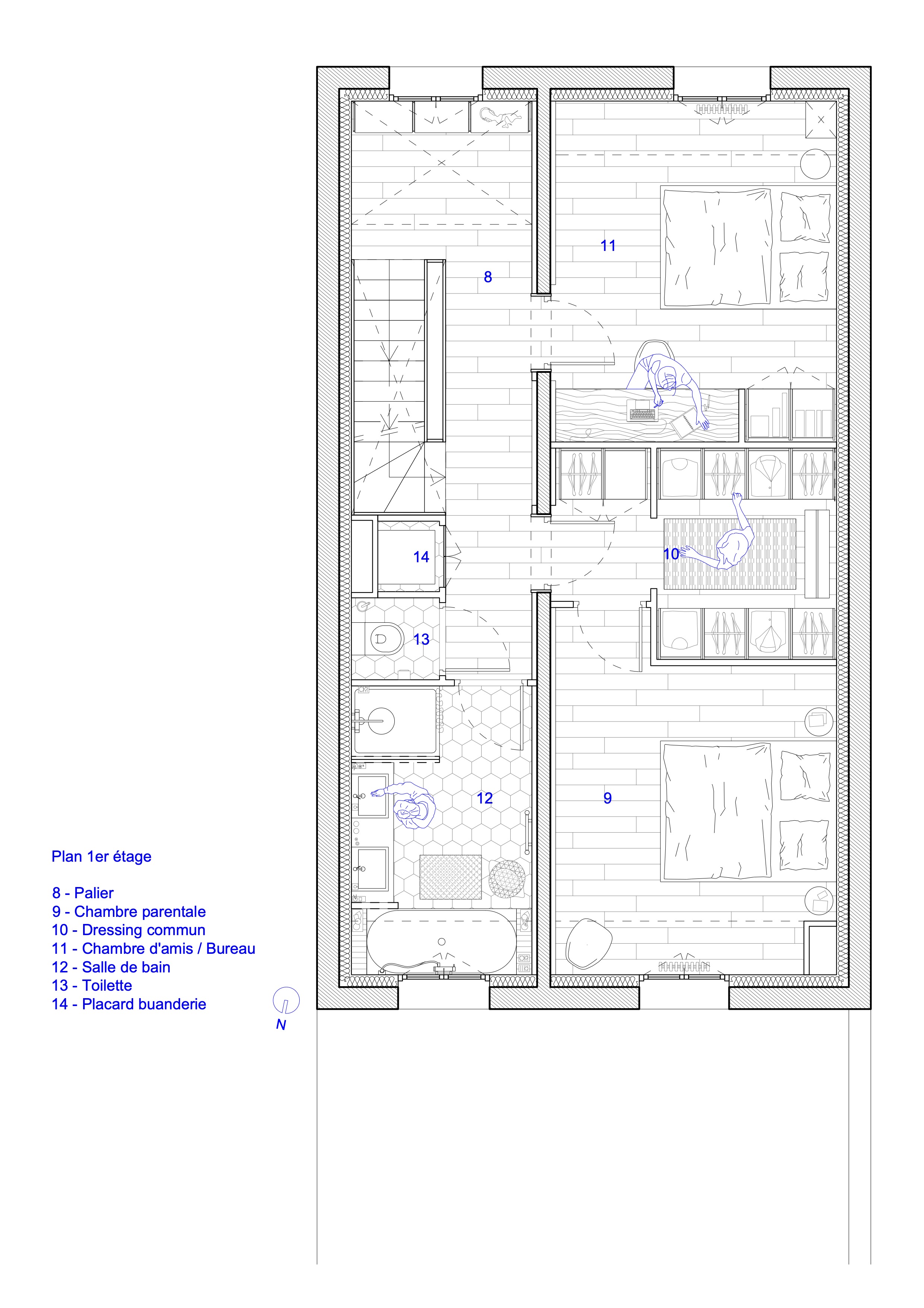 A l’étage, un agencement similaire est conservé pour les pièces sanitaires tout en étant optimisées pour gagner un placard buanderie et une double vasque dans la salle de bain. La partie nuit a été réagencée pour faire deux chambres indépendantes : une chambre d’ami / bureau côté rue et une chambre parentale côté jardin avec un grand dressing. Il a été choisi de centraliser les vêtements de toute la famille au même endroit afin de faciliter les usages : le matin les enfants s’habillent à côté de leurs parents qui se préparent également, le soir ils sortent directement du bain pour mettre leur pyjama. Tout est au même endroit quand il faut ranger le linge propre, préparer les valises, etc.